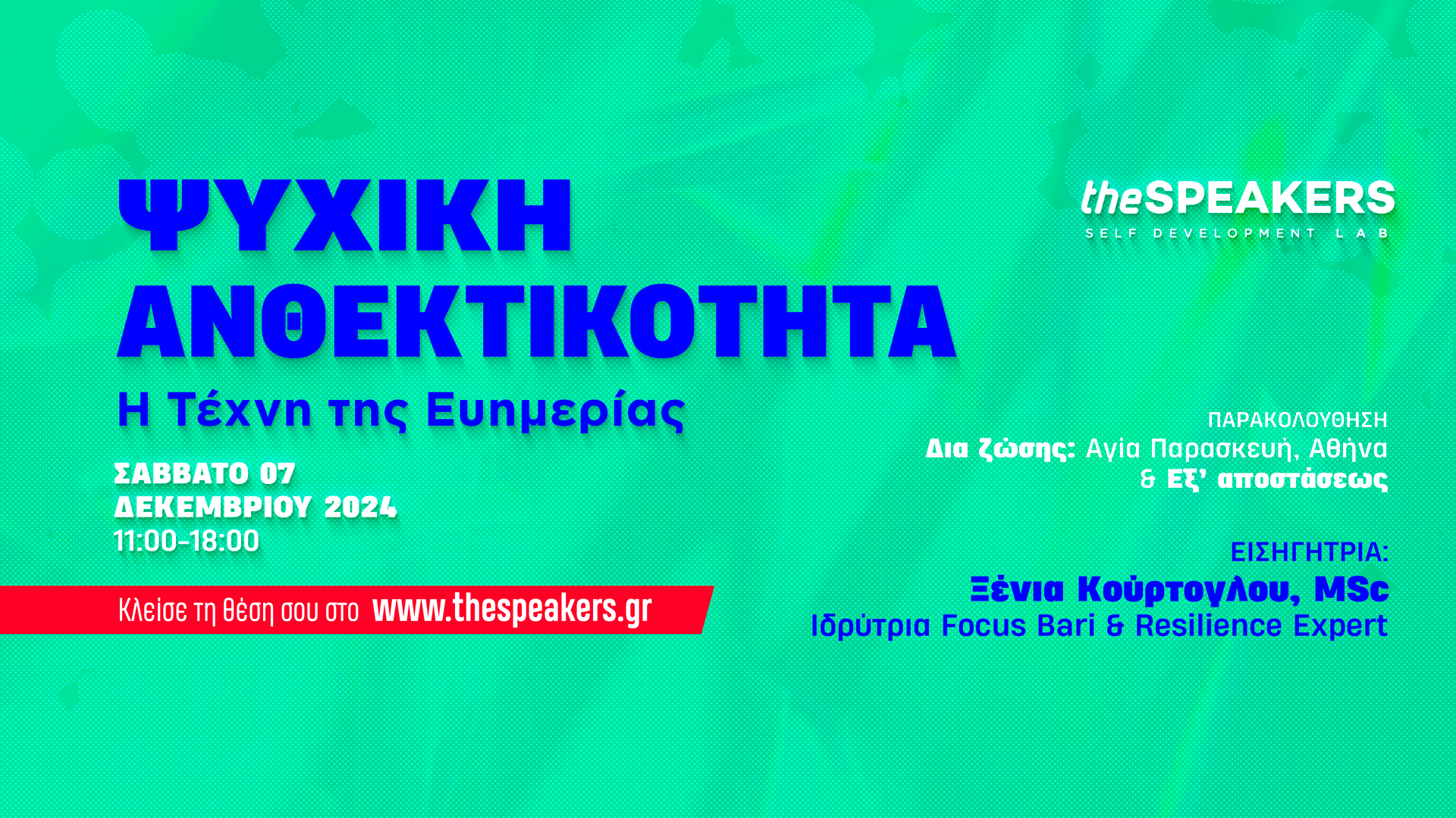 Με την ολοκλήρωση του workshop θα πάρετε έναν οδηγό Ψυχικής Ανθεκτικότητας μέσα από 10 πρακτικά βήματα, που μπορείτε να εφαρμόζετε από την επόμενη κιόλας μέρα, οδηγώντας τον εαυτό σας προς μια ζωή γεμάτη χαρά και ευημερία.